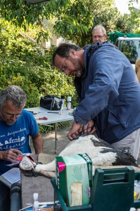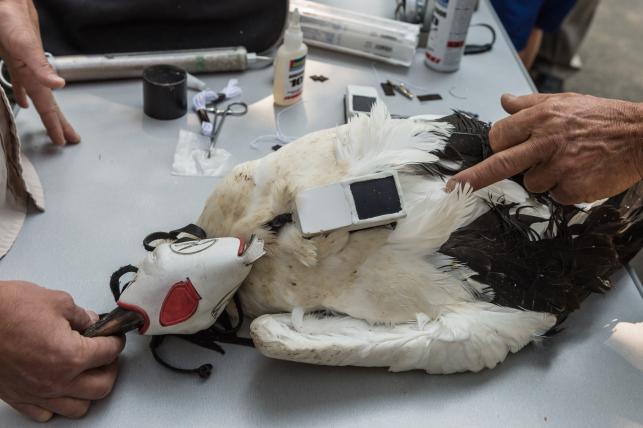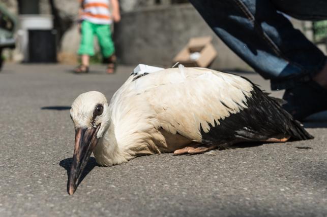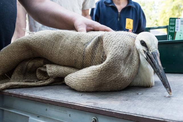 Storchendame «Helen» wurde schon vor 14 Jahren einmal besendert. Momentan ist sie im Zoo Basel und zieht dort Junge auf. Nun ist sie zum zweiten Mal zur Besenderung dran. Zusätzlich wurden zwei Jungvögel mit einem «Rucksäckli» ausgestattet. Für diese beiden Störche sucht der Zoo noch Namen. Vorschläge können unter www.zoobasel.ch/storch eingereicht werden.