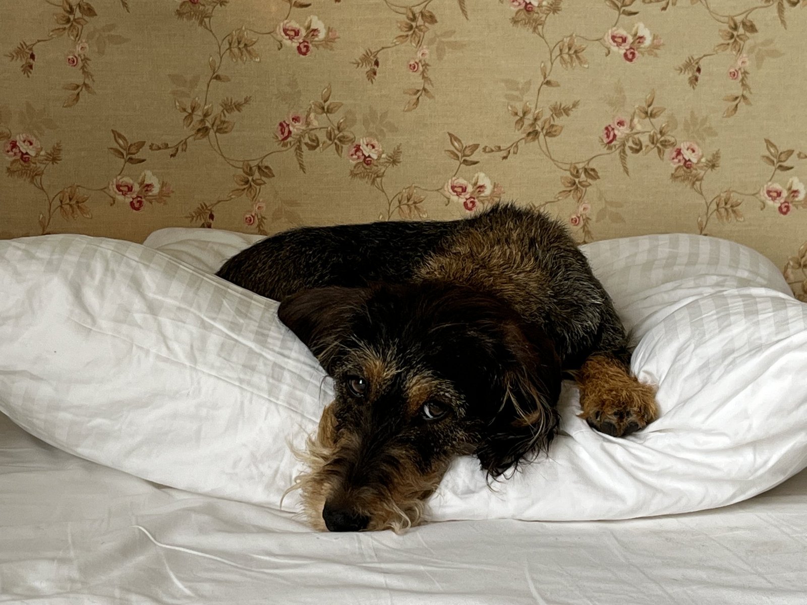 Aber auch für Entspannung war gesorgt. Im schönen Hotelbett mit den weissen Laken liess es sich selbst bei den warmen Temperaturen wohlig schlafen. Und sobald wir das Bett verlassen hatten, sicherte sich Frieda unsere Kopfkissen als Liegeplätzchen– ob das wohl den Vorstellungen des Hotelpersonals entsprach?