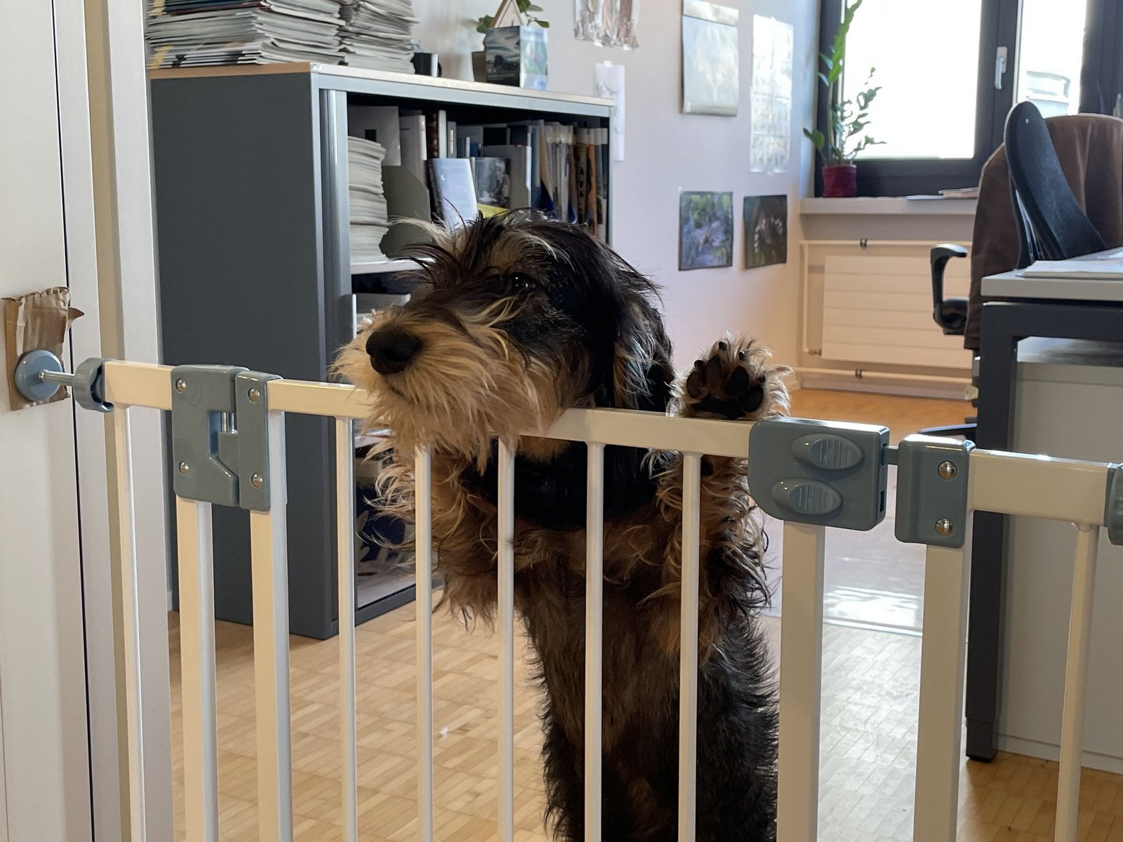 Und wenn das Intervall zwischen den netten Besuchen etwas gar lange wird. Legt sich Frieda hoffnungsvoll hinter ihr Kindergitter oder hinter die Glasscheibe und schaut mit ihrem herzerweichenden Dackelblick raus auf den Flur. Irgendjemand wird sich wohl erbarmen und einen kleinen Streichelstopp bei ihr im Büro einlegen.
