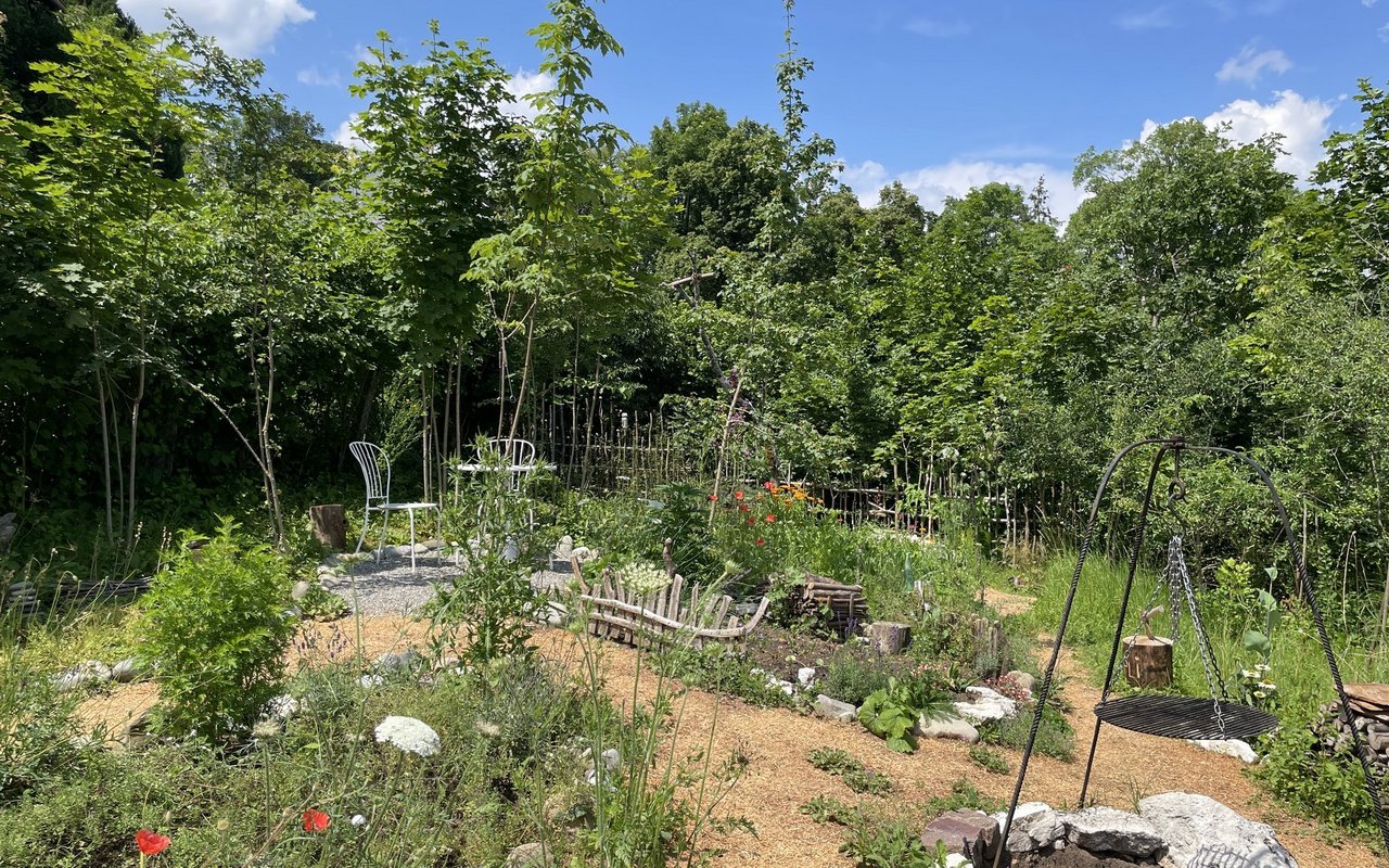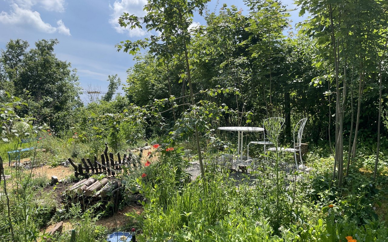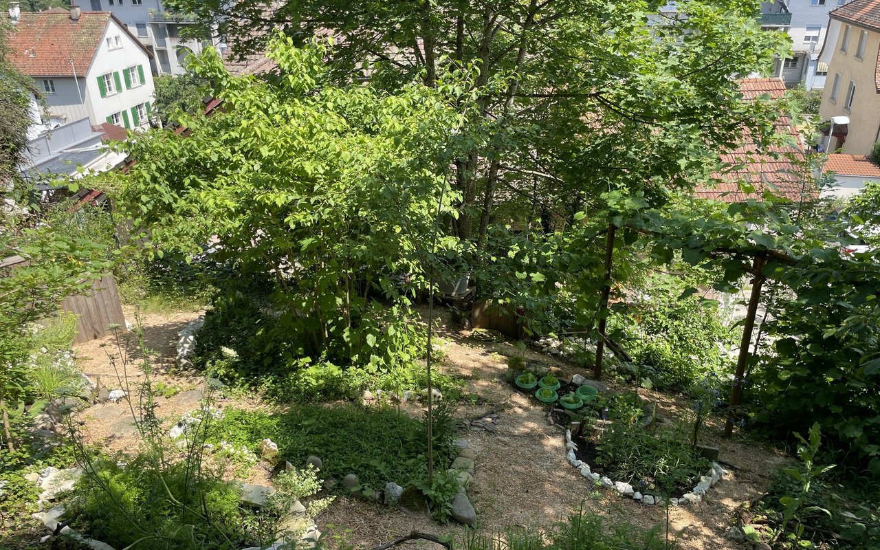 Viele Jahre arbeitete Cony Zwahlen auf dem Bau, hatte gar ein eigenes Geschäft. Nach einem Unfall musste sie sich komplett umorientieren und mietete eine Werkstatt, um aus Sturmholz Kunstskulpturen zu sägen und zu schnitzen. Die gegenüberliegende Böschung war zu der Zeit noch komplett mit Brombeeren, Weinreben und Berufkraut überwuchert, dazwischen lag viel Müll. Das juckte die naturverbundene Unternehmerin in den Fingern. Mit der Idee, einen Platz für Schmetterlinge zu schaffen, fragte sie ihren Vermieter, ob sie die verwilderte Böschung zähmen dürfe. Sie durfte und begann 2022 mit der Errichtung einer biodiversen Oase.