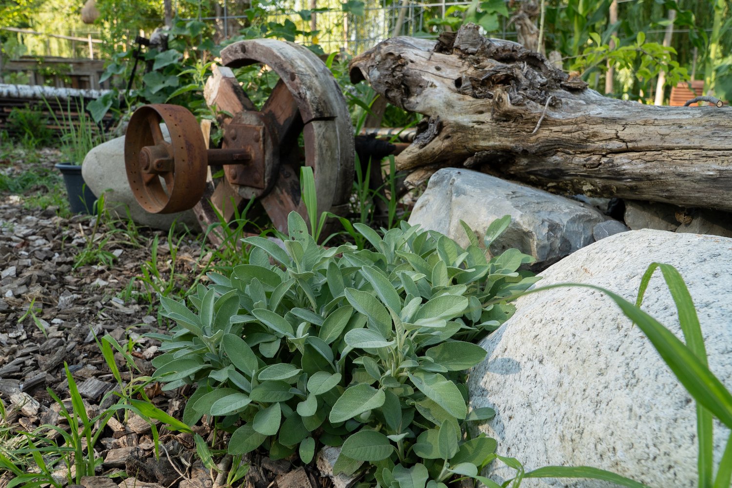 Nach diesem Prinzip hat Jeutter auch die 8000 Quadratmeter gestaltet: Vor der prächtigen Weide beim Eingang des Gartens wachsen links und rechts zwei Reihen wilder und alter einheimischer Obstsorten, die sich rings um das Herz des Projektes legen. Das Herz ist ein fast mannshoher Komposthaufen mit einem Sandarium daneben, das als Kreis ausgelegt ist. Um das zu bauen, hat der selbständige Maler ein Jahr lang über 10 000 Dachziegeln gesammelt und sie in drei Reihen im Kreis aufeinandergelegt, sodass sie als Sonnenfalle dienen. Dahinter gedeiht ein Gemüsegarten auf Mulch, den Jeutter mit Mähgut aus dem Garten düngt und feucht hält.