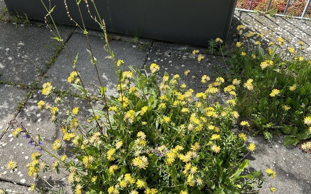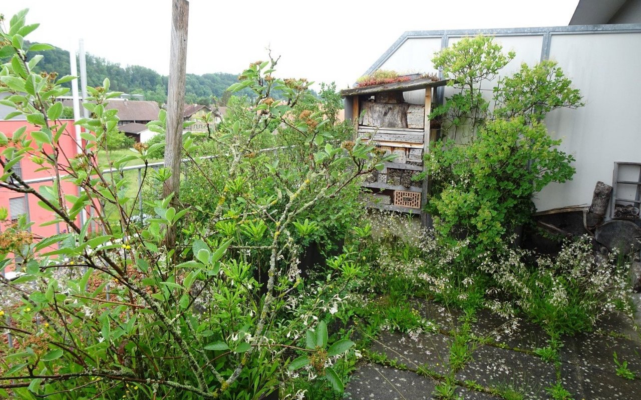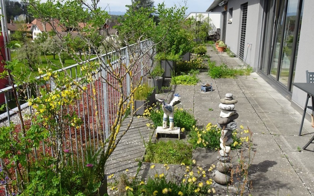 Auf der Terrasse stehen viele biodiverse Blumentöpfe und -kisten. Zusätzlich hat Markus Graf-Meyer vereinzelt Betonplatten entfernt, woraus nun gepflanzte sowie wilde Sträucher und Wildblumen spriessen. Und er hat eine Öffnung gar in eine Tränke umfunktioniert. Aus den Fugen zwischen den Betonplatten wachsen beispielsweise Wundklee, Nickendes Leinkraut und Wiesensalbei. Zudem gedeihen auch einzelne seltene Arten auf dem der Natur überlassenen Balkon, wie Seidelbast, Knäuelglockenblume oder Schweizer Alant. Den Insekten wird neben den reichhaltigen Nahrungsquellen ein selbst gebautes Hotel angeboten und den Vögeln wiederum verschiedene Nistkästen. So nisten Mauersegler, Feldsperlinge, Stare, Kohl- und Blaumeisen unter dem eigenen Vordach rund um die Wohnung. «Wir haben nun nicht nur eine Vielfalt an Pflanzen und Tieren, sondern es ist auch ein Erlebnis, mittendrin zu sein und beobachten zu können», freut sich Markus Graf-Meyer über seinen mit der Natur geteilten Lebensraum.
