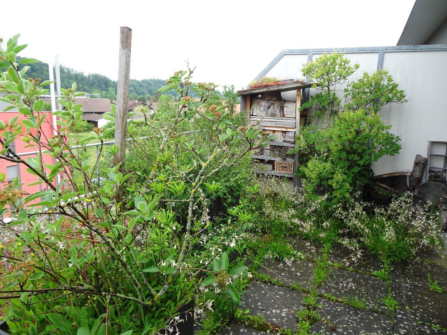 Vor 14 Jahren sind Markus Graf-Meyer und seine Frau in die Attikawohnung im 3. Obergeschoss eingezogen. Bereits vor Fertigstellung des Wohnkomplexes und dem bevorstehenden Einzug war es dem 70-Jährigen ein Anliegen, die 100 Quadratmeter grosse Terrasse mit angrenzendem Vordach zu begrünen und somit möglichst früh bei der Planung teilzunehmen sowie Vorschläge einzubringen. Einer dieser Vorschläge war ein 13 Meter langer Pflanzentrog, der später eine Vielzahl von einheimischen Pflanzen beheimaten sollte. Nach mehreren Gesuchen, Bewilligungen und dem Einverständnis der anderen Wohnparteien konnte aus der zuerst geplanten Sterilität ein grünes Paradies mit verschiedenen Lebensräumen entstehen.
