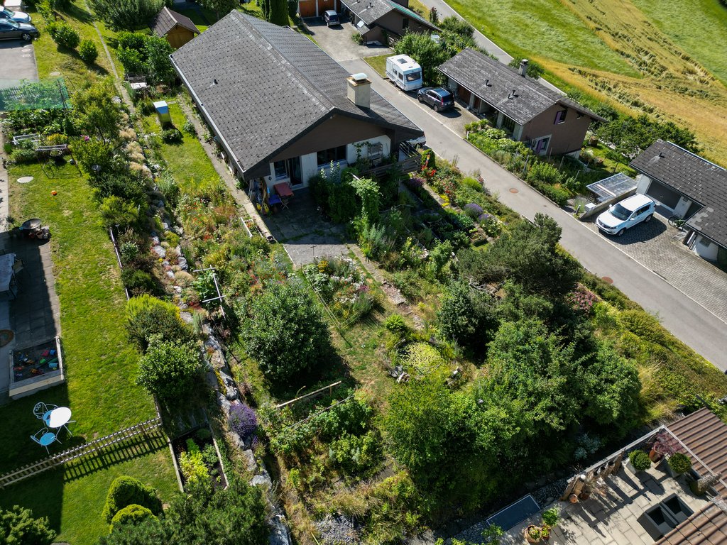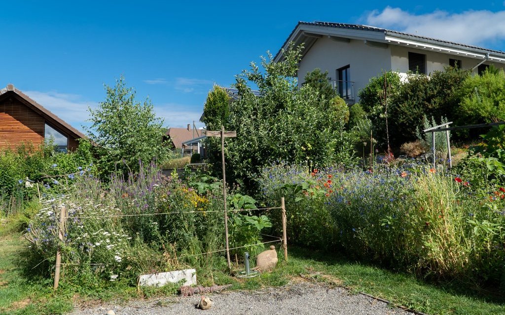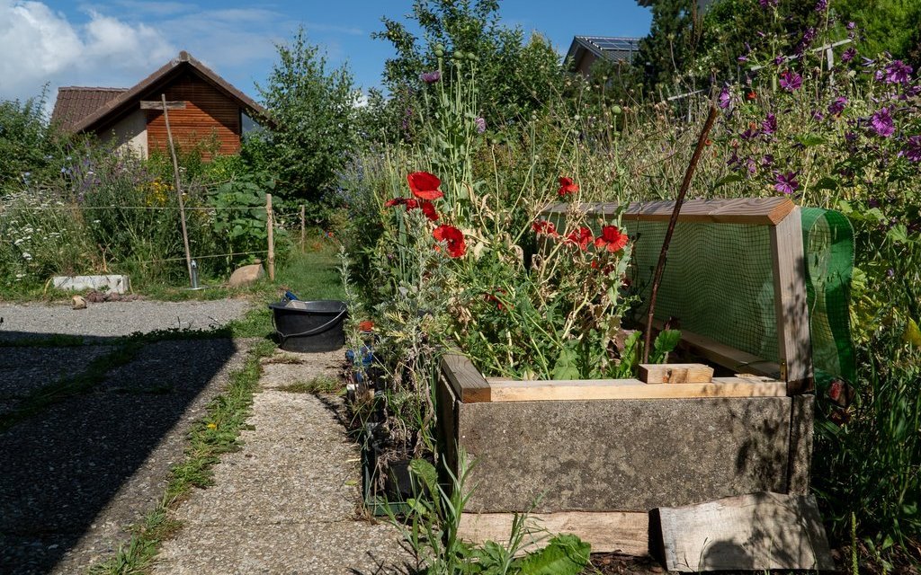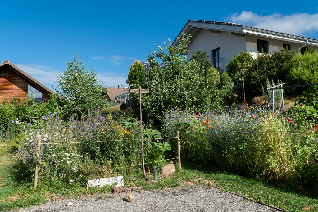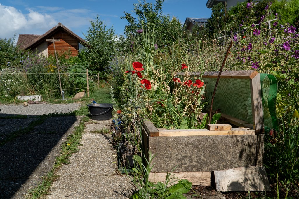 Ursprünglich wollte der zweifache Vater einen Gemüsegarten anlegen. Aber er habe es nie übers Herz gebracht, das «Unkraut» zu jäten. Jetzt wächst alles ein bisschen nebeneinander: Der Kürbis auf dem ehemaligen Komposthaufen, der Fenchel neben den Farnen, die wilde Möhre neben Mohn und Malven. So präsentiert sich am Südhang bei Fahrni ein wild gepflegter Naturgarten mit einmaliger Aussicht auf die Alpen. «Ich möchte zeigen, dass man auch in einem kleinen Mietgarten etwas Schönes kreieren und Platz für Wildtiere schaffen kann.» Als nächstes will er die Kaukasus-Fettkraut-Überreste durch Thymian ersetzen und aus dem Kiesplatz einen Sandplatz für Bienen machen.