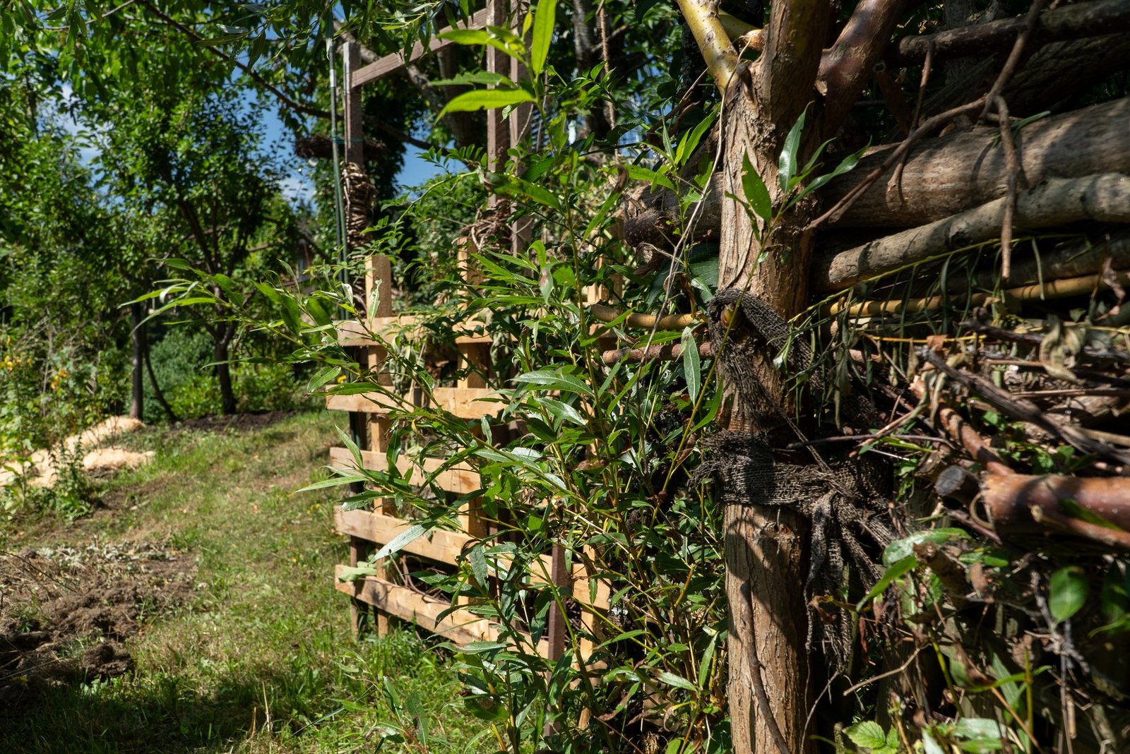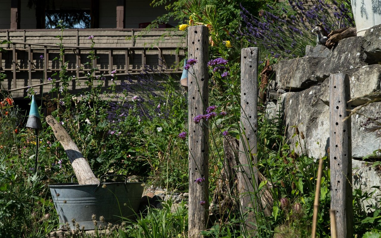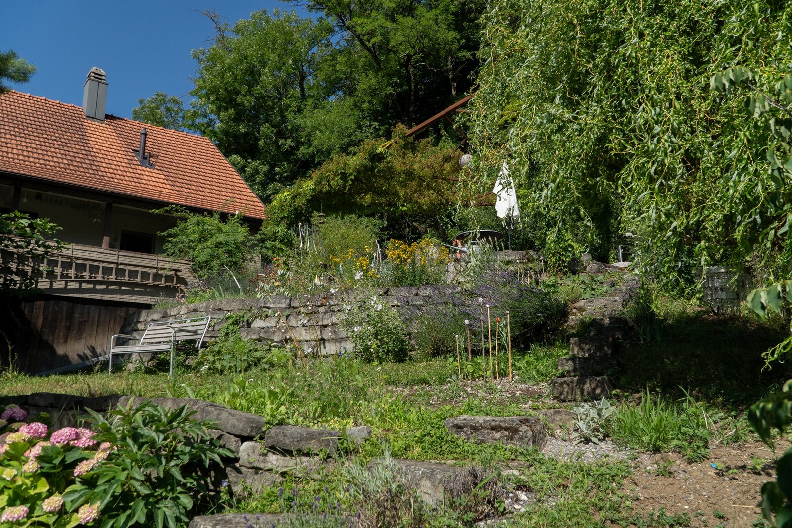 Eigentlich wollte Mira Romer nur eine Abwechslung zum Alltag als Mutter. «Aber es ist immer mehr geworden», sagt die 51-Jährige heute lachend. Von ihrer Terrasse aus am Südhang in Altstätten blickt man auf die Österreicher Alpen, über Rheintal und ihren 1000m2 grossen Garten, den sie seit 10 Jahren intensiv bearbeitet und gestaltet: Hier blühen diverse Wildblumen auf drei selbst gebauten Trockensteinmauer-Ebenen mit Wassertrögen und Lehmhaufen für Wildbienen. Im unteren Teil des Gartens wird es etwas wilder. Hier will die gelernte Köchin eine Permakultur anlegen und setzt auf einheimisches Gehölz und Wildobst wie Aronia, Schlehdorn, Holunder, Sanddorn, Kornelkirsche und wilde Mirabellen. Etwas versteckt zwischen den Bäumen, hinter den Hochbeeten und dem Gewächshaus steht eine grosse Benjeshecke mit viel Totholz, Ästen und Laub, daneben ein kleiner Teich. Weiter vorne beim 114-jährigen Holzhaus finden Wildtiere Nahrung und Unterschlupf in diversen Stein- und Totholzstrukturen und Wildblumen.