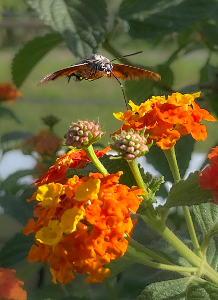 Die Blaue Holzbiene und das Taubenschwänzchen. Letztes Jahr war das Heupferd besonders spektakulär.