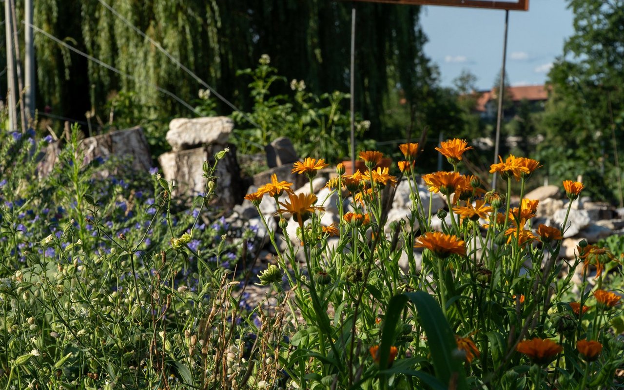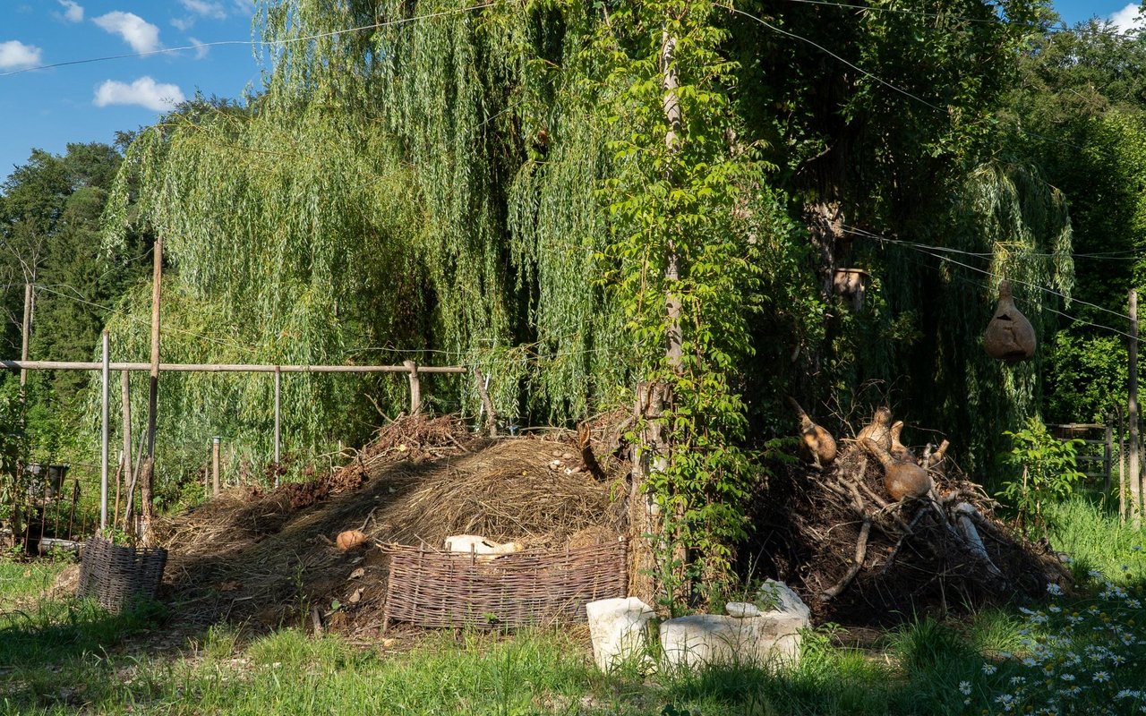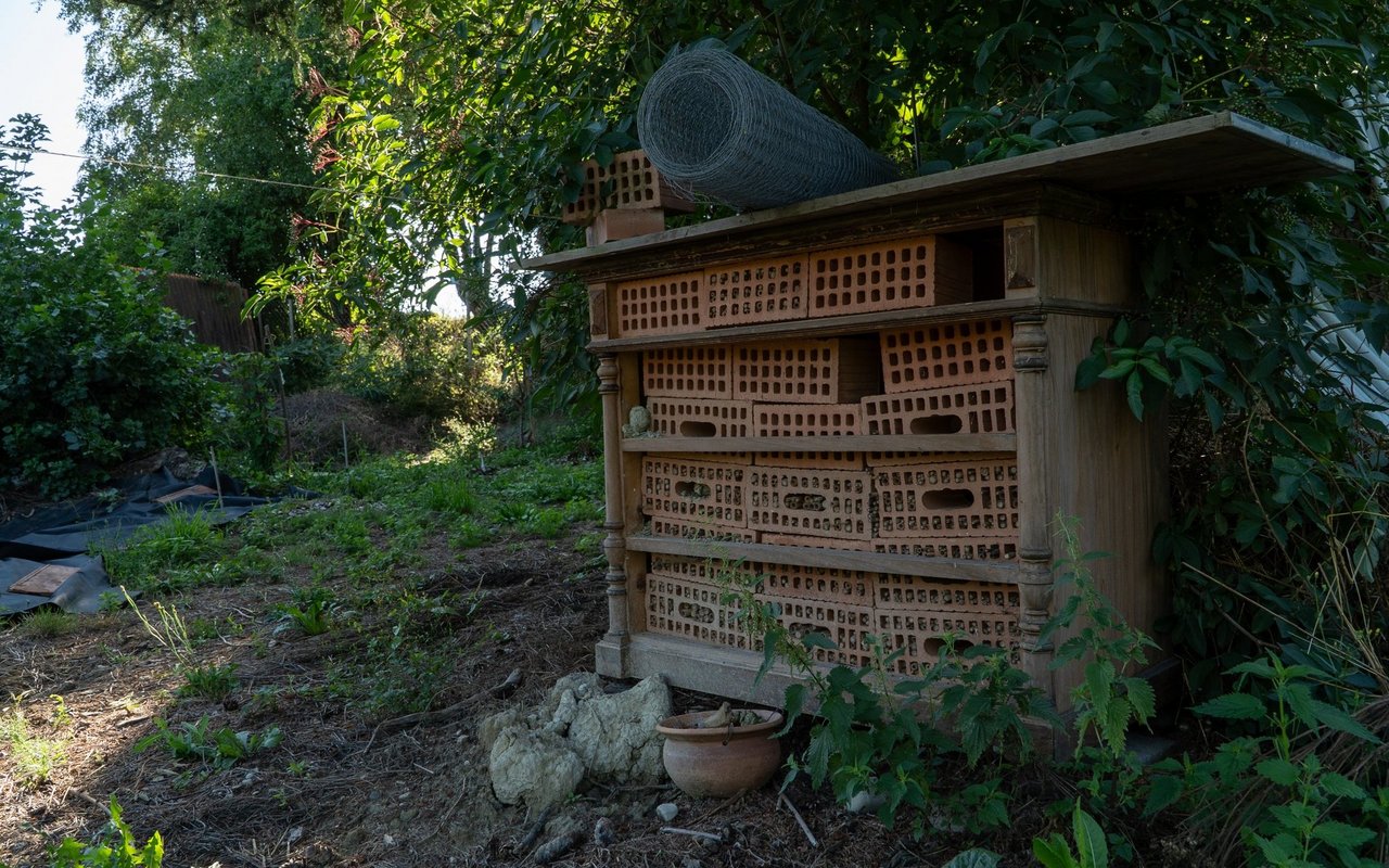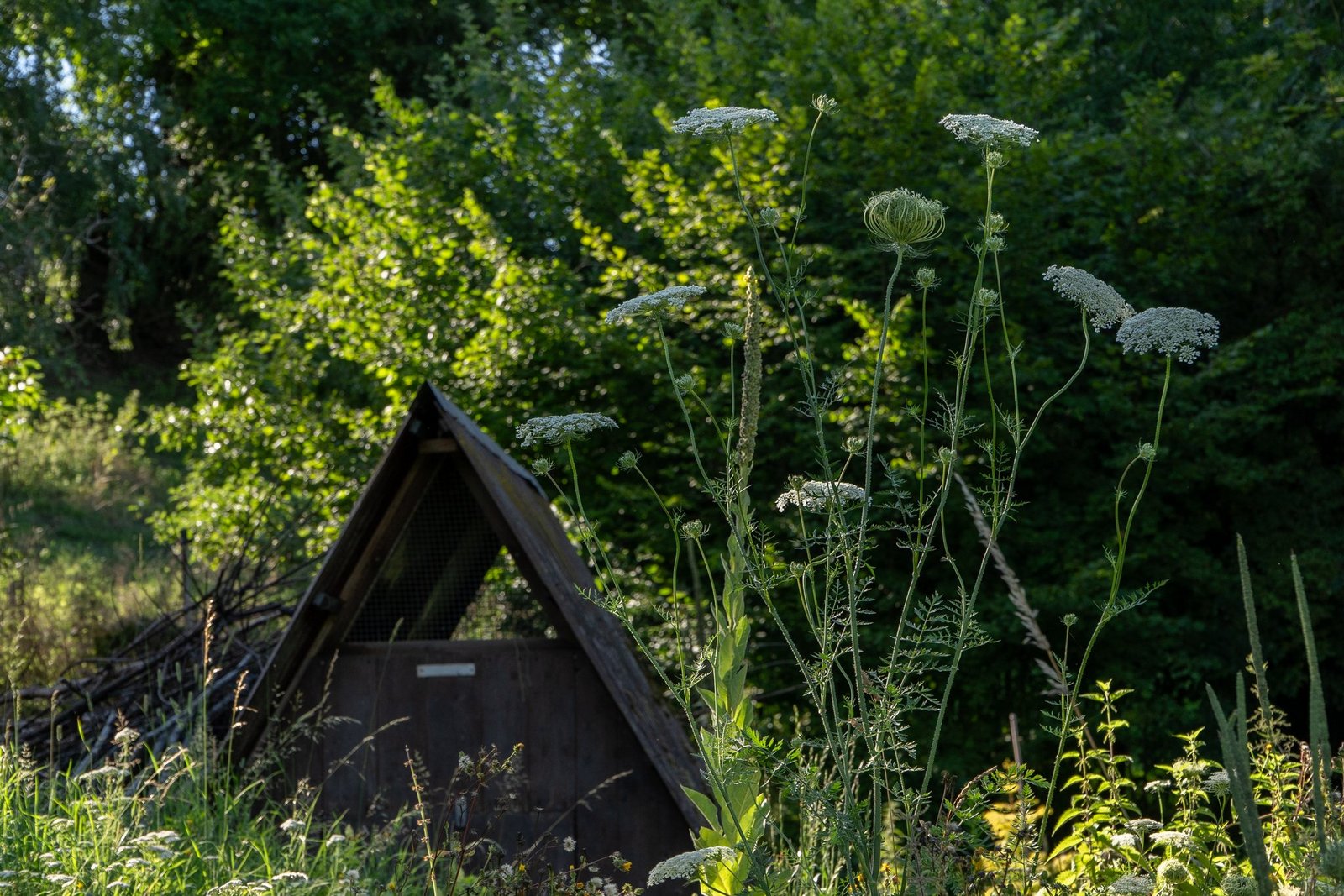 Am Hang wachsen diverse junge Obstbäume und Wildstauden: Hochstamm Apfelbäume, Walnuss, Marroni, Bayerische Kiwi, Mispel und vieles mehr. Das Herz seines Gartens, wie er es nennt, ist der grosse Kompost zwischen dem vorderen und dem hinteren Bereich. Das Ganze wird gegen Westen durch eine wilde Wiese und eine 90 Meter lange Benjeshecke zum Nachbaren abgegrenzt. Dort haben sich bereits diverse Kröten und Frösche in drei kleinen Teichen eingenistet, die sich zwischen Rohrkolben und Seerosen zuhause fühlen. «Es wird jedes Jahr schöner», sagt Jeutter. Er habe aber noch ganz viel vor, etwa weitere Trockensteinmauern oder einen Käferkeller bauen.