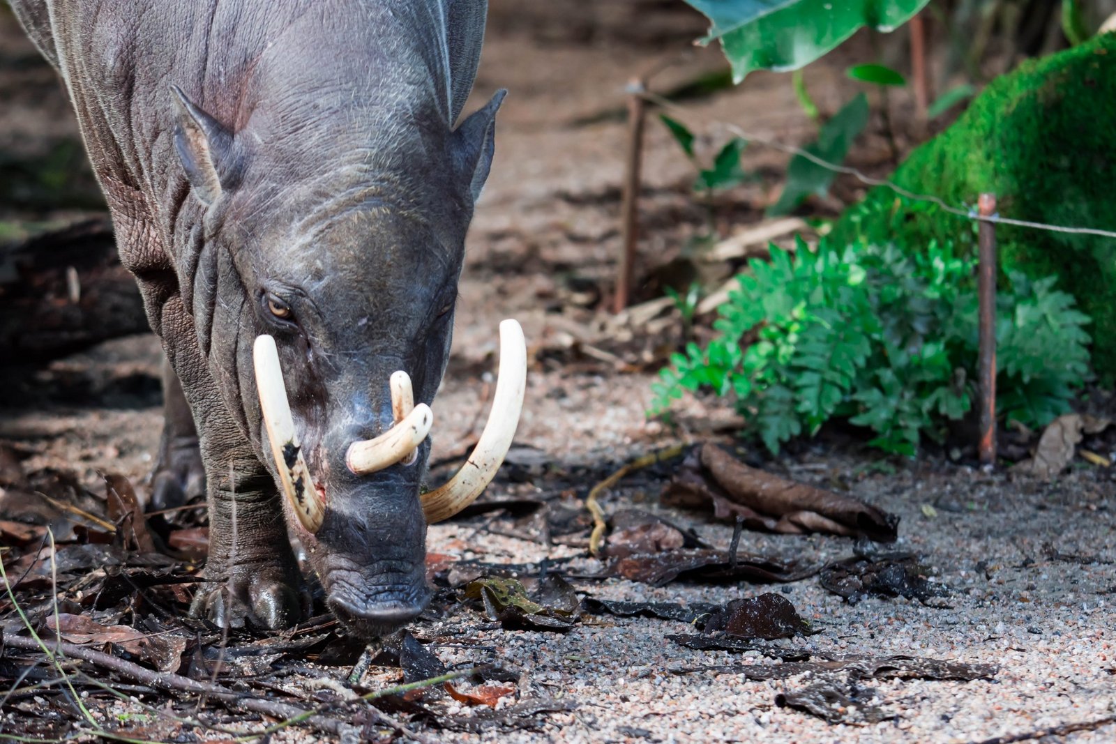 Sein «Geweih» an seinem Rüssel verleiht dem Hirscheber ein imposantes Aussehen. Die Hauer wachsen durch die Rüsseldecke nach oben und bilden einen Bogen.